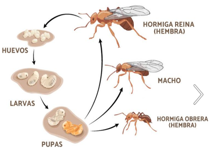 Tienen fases de huevo, larva, pupa y adulto. Los adultos se diferencian en clases (ver imagen anterior):