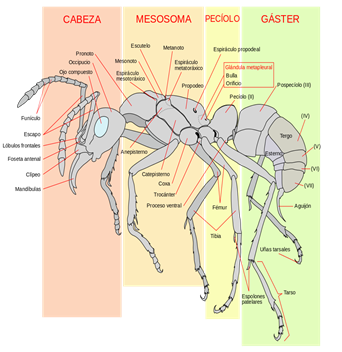 Se han encontrado hormigas de diferentes tamaños y variedad de colores, en dependencia de la especie de hormiga. Algunas especies incluso tienen alas, por lo que pueden volar, El cuerpo de las hormigas tiene tres partes diferenciadas: la cabeza, el tórax y el gáster (parte del abdomen que está después de la cintura). Su cintura puede tener uno o dos pequeños segmentos, según la especie.