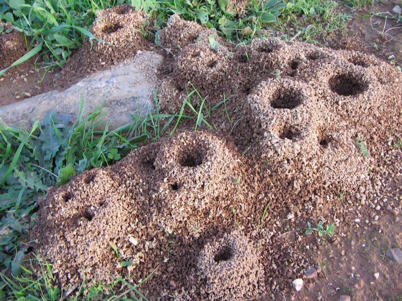 Algunas hormigas construyen su nido por debajo de la tierra, haciendo un montículo de tierra en sus entradas, esa tierra que a simple vista es suave y suelta, es el excedente que ellas sacan del nido, dentro de la colonia existen lugares dedicados a la incubación de los huevos, otro para almacenar la comida, como también un lugar especial para la reina.