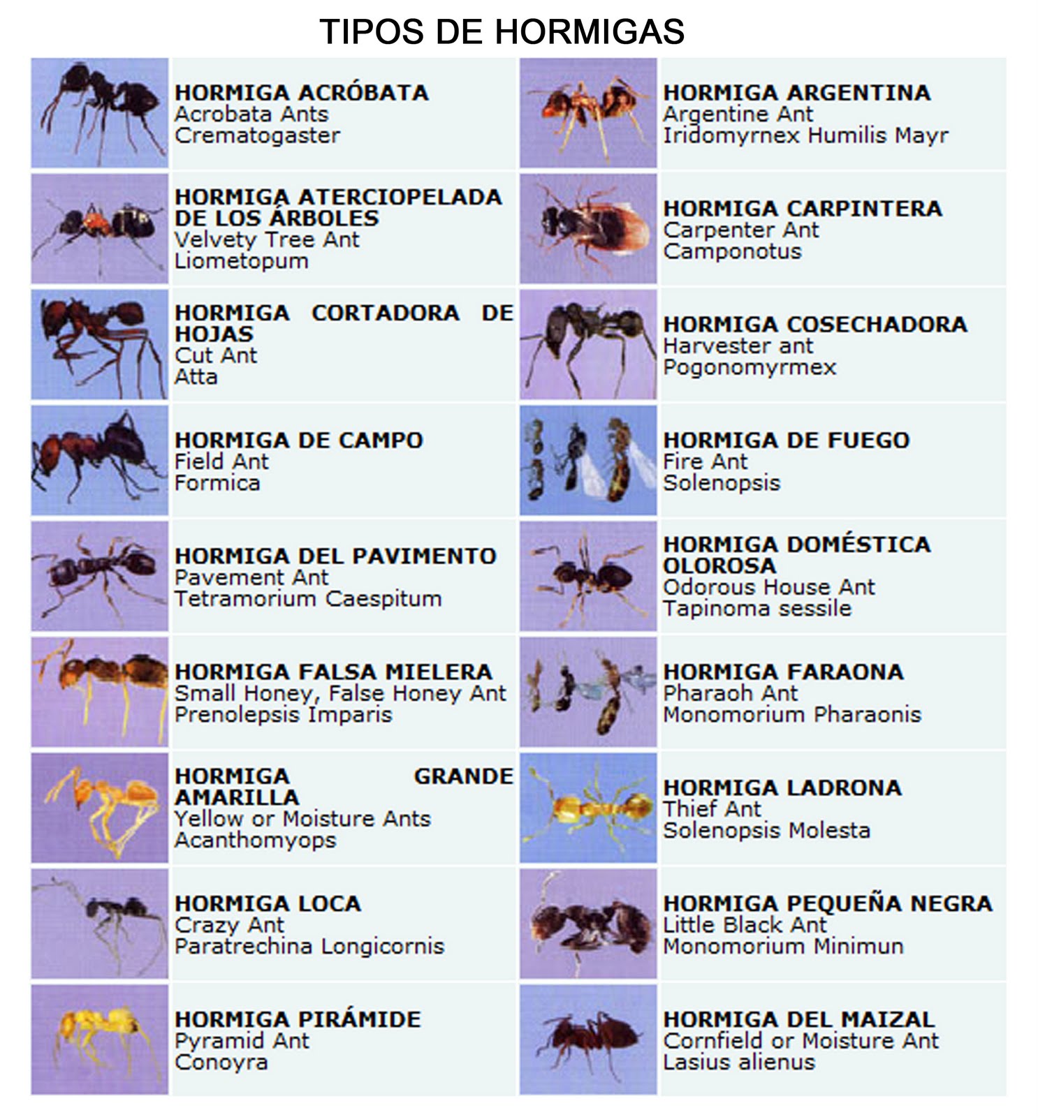 Las Hormigas que más afectan a las personas son las hormigas arrieras por los daños estructurales, deshoja de arboles en especial cuando vivimos o laboramos en zonas boscosas, también tenemos las hormigas dulceras, que atacan alimentos en especial las vemos en áreas urbanas.