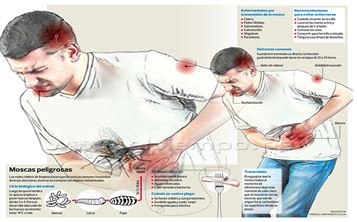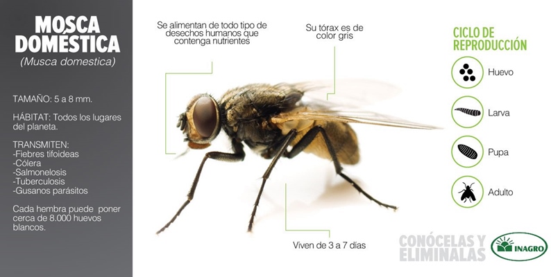 Las moscas pese a ser consideradas como “habituales” deben ser controladas porque son capaz de transmitir una gran variedad de enfermedades; Bacterianas (diarrea, tifus, conjuntivitis, mastitis), cólera, fiebre tifoidea, disentería, lombrices, salmonelosis, hepatitis A, y polio. Actúan transportando microorganismos en las vellosidades de las patas. La lista de enfermedades causadas por las moscas es muy extensa, sin embargo, haremos referencia a dos tipos especie: la mosca del sueño y la mosca negra