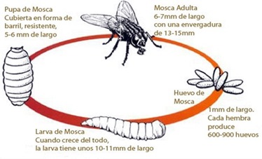 El Ciclo de vida de la mosca pasa por una metamorfosis, también conocido como transformación, se trata de un proceso biológico, donde el ser vivo va de un estado a otro, durante su ciclo de vida. La mosca pasa por cuatro fases: huevo, larva, pupa y la etapa adulta.