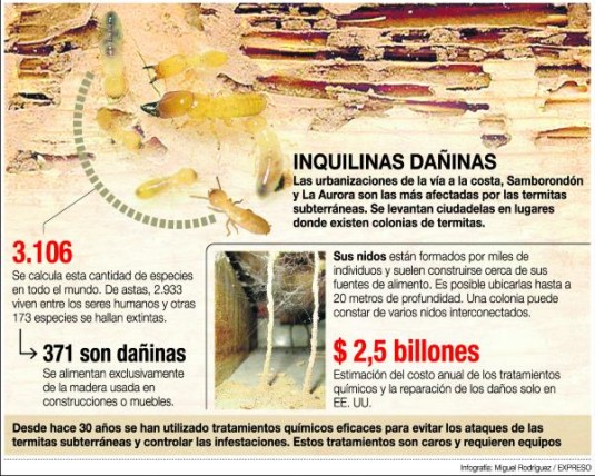 Los isópteros (alas iguales) conocidos vulgarmente como: termitas, termes, turiros, comejenes y hormigas blancas, Son un grupo de insectos sociales que se alimentan de la celulosa contenida en la madera y sus derivados como el papel, cartón, entre otros, degradándola gracias a la acción de los protozoos su sistema digestivo.