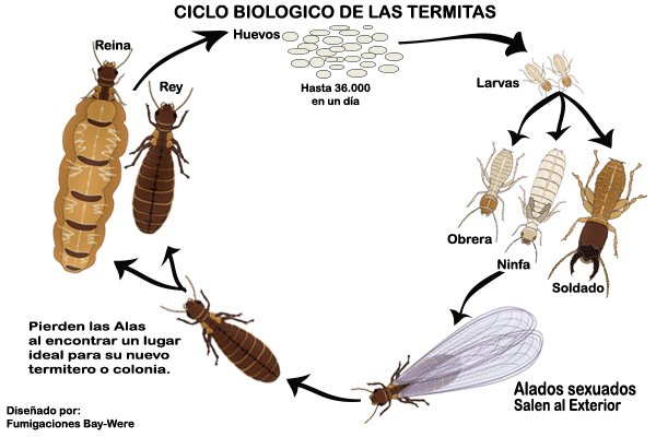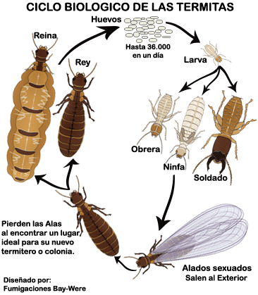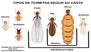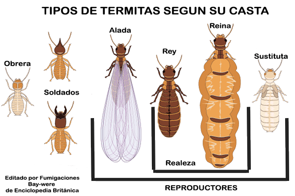 En la sociedad de las termitas, como en las hormigas, también existen castas ya que se trata de una organización social. Se basan en una alimentación contenida de celulosa extraída de la madera. las cuales algunas se conocen como plagas y otras como la biomasa de nuestra tierra. Estos animales son insectos muy diminutos, su tamaño es aproximadamente unos 2cm (dos centímetros), tienen tres pares de patas y un cuerpo que está dividido de la siguiente manera: